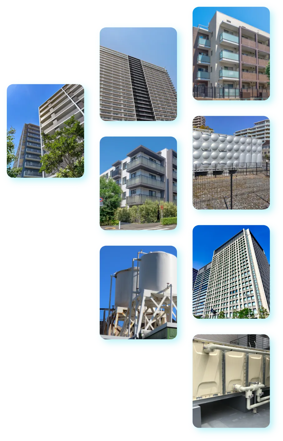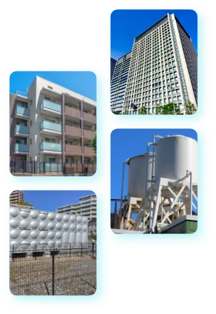 現状の給水量に合わせて受水槽をサイズダウンなどお客様の使用状況に沿った提案から、受水槽の交換だけでなく高架水槽(高置水槽)の廃止、直結給水方式への切替など、将来的な設備運用を踏まえた幅広い視点で提案を行います。